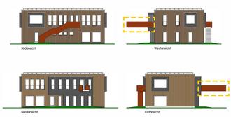 Diese Planzeichnung des Erweiterungsbaus zeigt die Variante MIT Verbindungsbau (gelbe Einkastelung). Beschlossen wurde - auch aus Kostengründen - im Gremium schlussendlich die Variante 2 (zweigeschossig, ohne Verbindungsbau).
