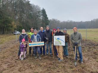 Mitarbeitende des Landschaftspflegeverbands Mittelfranken, freiwillige Helfer sowie Bürgermeister Jürgen Jäkel pflanzen über 830 Sträucher und Wildobstbäume als Ausgleichsmaßnahme für das Baugebiet Bergstraße/Neuenbürger Weg.