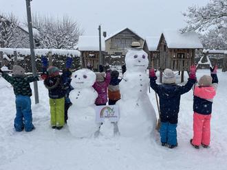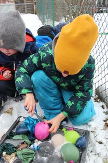 Der Winter zeigte sich ebenfalls von seiner spannenden Seite. Die Krippe holte den Schnee kurzerhand nach drinnen: Es wurden Schneemänner gebaut, Schnee gefärbt und beobachtet, wie er langsam schmilzt. Bei winterlichen Spaziergängen konnten die Kinder die kalte Jahreszeit mit allen Sinnen erleben.