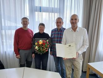 Die Gemeinde Großenseebach dankt Karola Hofmann herzlich für ihre 25-jährige Treue und ihr verlässliches Engagement. Am 14. Januar 2026 überreichten der Erste Bürgermeister Jürgen Jäkel und der Leiter des Personalamtes Wolfgang Meier persönlich die Ehrenurkunde zum Jubiläum und gratulierten zu diesem besonderen Meilenstein. Dass Frau Hofmann dem Gemeindedienst so lange treu geblieben ist, zeigt, wie wohl sie sich hier fühlt, freuten sich alle Gratulanten.