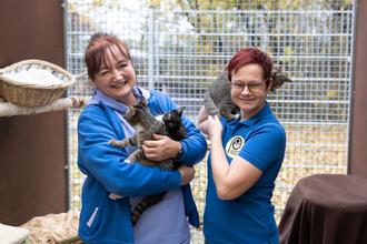 Manuela Braunmüller (links) und ihre Mitarbeiterin zu Besuch im Katzengehege.
