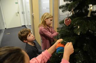 Fleißige Helfer und große Augen beim Dekorieren des Christbaums