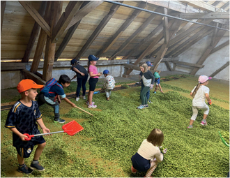 Mitten im Hochbetrieb der Hopfenernte nahm sich Christine Schwarzmeier Zeit und öffnete ihren Hof für rund 20 neugierige Nachwuchs-Hopfenbauern. Mit großer Begeisterung bestaunten die Kinder die Zupfmaschine, den großen Ofen zum Trocknen und die Verpackungsanlage. Ein echtes Highlight: Mit Schneeschaufeln durften die jungen Gäste selbst die getrockneten Dolden in die Verpackungsmaschine schaufeln – wie die Großen!