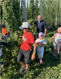 Im Anschluss ging es mit dem Bulldog von Stefan Tschirn hinaus aufs Hopfenfeld. Dort konnten die Kinder nicht nur zusehen, wie die Ernte abläuft, sondern auch selbst kräftig mit anpacken: hängen gebliebene Reben wurden kurzerhand von kleinen Händen heruntergezupft.