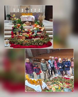 Zusammen mit ihren Lehrerinnen Frau Brand, Frau Dotzer und Frau Schalk bewunderten sie die liebevoll arrangierten Lebensmittel, Blumen und Gegenstände dort. Verschiedene Kinder erzählten dann, wofür sie in ihrem Leben besonders dankbar sind. Ein gemeinsames Gebet rundete den Besuch in der Kirche ab.