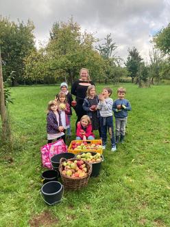 An einem sonnigen September-Nachmittag trafen sich einige Kinder des Kindergartens Sternschnuppe, um auf einer Streuobstwiese in Burgstall Äpfel zu pflücken.
