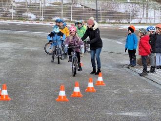 Zunächst wurde noch überprüft, ob die Helme gut sitzen und die Sitze der Räder wurden passend eingestellt. Die Schülerinnen und Schüler durften sich eine Runde einfahren und schließlich den Übungsparcours absolvieren.
