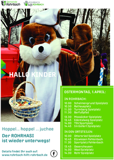 Bereits zum vierten Mal hoppelt Rohrhasi in der Osterzeit durch das Rohrbacher Gemeindegebiet und sorgt für leuchtende Kinderaugen. Wer den leibhaftigen Rohrhasi gerne kennenlernen möchte, hat am Ostermontag die einmalige Gelegenheit dazu. Rohrhasi und sein Team halten an verschiedenen Spielplätzen und Sportanlagen im ganzen Gemeindegebiet und verteilen Süßigkeiten.