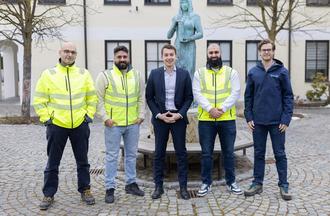 Abdulkadir Erdogan (Projektleiter Euronet), Umut Bulut (Bauleiter Euronet), Bürgermeister Christian Keck, Mehmet Ergül (Projektmanager Euronet) und Josef Tiefenbach (Bauüberwacher GlasfaserPlus) freuen sich über den Abschluss der Tiefbauarbeiten am Glasfasernetz.