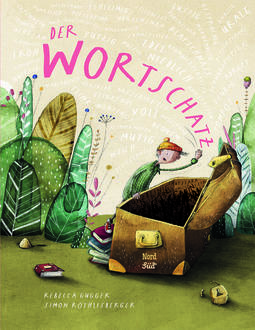 Ein Junge findet eine Schatzkiste und ist ganz enttäuscht, dass nur Buchstabenreihen darin sind. Als er das erste Wort einfach rauswirft, merkt er, dass die Wörter Wirkung haben: Ein Igel wird von dem Wort „quietschgelb“ getroffen und ist sofort quietschgelb (und taucht so auch immer wieder im Buch auf), ein Käfer wird riesig, ein Vogelhäuschen durch das Wort „pompös“ ein richtiges Schloss usw. Es macht ihm so viel Spaß, dass in kürzester Zeit die Schatztruhe leer ist. Damit kann er sich, nachdem er „Blut geleckt“ hat, nicht mehr zufriedengeben und sucht Möglichkeiten, neue Wörter für seine Schatzkiste zu bekommen. Gottseidank trifft er Louise, die ihm zeigt, wie man Wörter erfinden kann. „Dazu packe ich alle meine Sinne ein und gehe damit auf Wörtersuche… Denn Wörter findest du jederzeit und überall“, erklärt sie ihm. Und die vielen nun entstehenden Wörter machen den Lesern so viel Lust auf eigene Wortschatz-Hebungen, dass sicher keiner den Bilderbuchparcours verlässt, ohne zu fantasieren, zu erfinden und über die Ideen der anderen zu lachen.