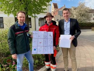 Revierförster Andreas Ploner (links) bei der Übergabe des Forstwirtschaftsplanes mit Martin Probst (mittig) und Erstem Bürgermeister Christian Keck (rechts)