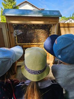Aufgeregt versammelten sich die Kinder um den Imker, als er sie durch den Bienenstand führte und ihnen auch die verschiedenen Werkzeuge und Geräte zeigte, die er bei der Arbeit verwendet. Von der Schutzkleidung (auch in Kindergröße zum Probieren), bis hin zur Smoker (der Vorrichtung, mit der Rauch erzeugt wird, um die Bienen zu beruhigen), durften die Kindergartenkinder alles aus nächster Nähe betrachten. Ganz genau wurde beobachtet, wo sich die markierte Königin im Glas-Bienenschaukasten befindet, und bestaunt, mit welcher Akribie die Bienen die Mittelwände der Waben mit Wachs sechseckig weiterbauen und den Honig in den Waben ablegen. Mit Wachs werden diese dann von den emsigen Tierchen verschlossen.