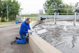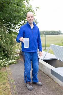 In den Belebungsbecken findet die biologische Reinigung über Mikroorganismen statt; im Bild nimmt Josef Thalmeier eine Gewässerprobe.