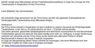 4In diesem Fall erklärt sich die Fraktion bzw. das jeweilige Gemeinderats-Mitglied auch damit einverstanden, dass keine Anonymisierung für die Veröffentlichung im gemeindlichen Mitteilungs- und Informationsblatt erfolgt.