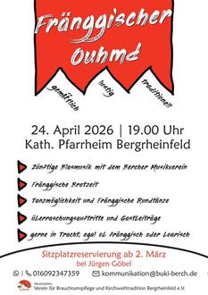 wie bereits angekündigt findet der Fränggische Ouhmd am Freitag 24.02.2026 im Pfarrheim Bergrheinfeld statt.