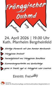 wie bereits angekündigt findet der Fränggische Ouhmd am Freitag, 24.02.2026 im Pfarrheim Bergrheinfeld statt.