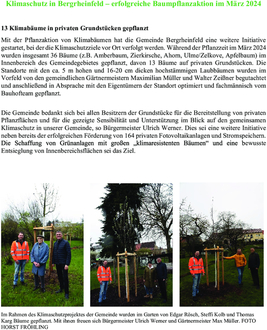 Die Gemeinde bedankt sich bei allen Besitzern der Grundstücke für die Bereitstellung von privaten Pflanzflächen und für die gezeigte Sensibilität und Unterstützung im Blick auf den gemeinsamen Klimaschutz in unserer Gemeinde, so Bürgermeister Ulrich Werner. Dies sei eine weitere Initiative neben bereits der erfolgreichen Förderung von 164 privaten Fotovoltaikanlagen und Stromspeichern. Die Schaffung von Grünanlagen mit großen „klimaresistenten Bäumen“ und eine bewusste Entsieglung von Innenbereichsflächen sei das Ziel.
