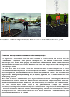 Die bayerische Landesanstalt für Wein- und Gartenbau in Veitshöchheim, hat im Jahr 2010 ein Klimawandel - Projekt ins Leben gerufen (Stadtgrün2021), bei dem sie sich mit dem Problem beschäftigen, dass immer mehr gängige und heimische Stadtbaumarten immer stärker unter den zunehmend wärmeren und trockeneren Sommern und unter neu eingewanderten Schädlingen und Erkrankungen leiden.