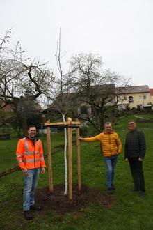 Im Rahmen des Klimaschutzprojektes der Gemeinde wurden im Garten von Edgar Rösch, Steffi Kolb und Thomas Karg Bäume gepflanzt. Mit ihnen freuen sich Bürgermeister Ulrich Werner und Gärtnermeister Max Müller.