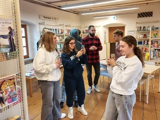 Zum Einstieg ins Programm begrüßte Frau Paul, als Verantwortliche für die Schülerbibliothek und Mitarbeiterin der Gemeindebibliothek, die Gruppe mit einer kurzen Einführung zum Ort der Veranstaltung. Die Gäste zeigten sich dabei sehr beeindruckt vom über 350 Jahre alten historischen Gebäude sowie vom Angebot der Bibliothek.