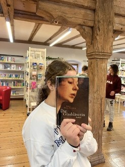 Im zweiten Teil des Projektes durften die Schüler und Schülerinnen mit ihren Gästen in Kleingruppen durch die Bibliothek streifen, um sog. „Bookfaces“ zu erstellen. Dabei werden Fotos mit dem eigenen Handy von Buchcovern gemacht, die so gehalten werden, dass sie idealerweise mit der Umgebung verschmelzen.