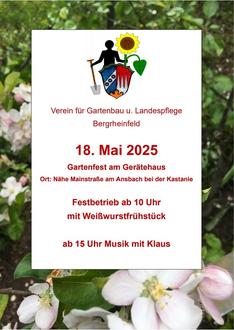 Unser diesjähriges Gartenfest findet statt am Sonntag, den 18. Mai 2025 ab 10 Uhr mit dem Frühschoppen und einem Weißwurstfrühstück. Nachmittags haben wir Kaffee und selbstgebackene Kuchen in reicher Auswahl zur Verfügung sowie die üblichen Speisen, wie Bratwürste, Steaks, Pommes frites, Fischbrötchen sowie Laugenstangen.