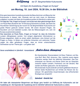 Eine ganz besondere Ausstellung erwartet die Besucherinnen und Besucher der Kulturwoche in diesem Jahr. Erstmals wird sie nicht innen im Zehnthaus aufgebaut, sondern als Open-Air-Ausstellung außen im Zehnthof zu sehen sein. Sie trägt den Titel „Fragen an Europa“ und wurde nach dem gleichnamigen Buch von Paula Riek (Studentin der TH Würzburg-Schweinfurt) erstellt, das Dank der freundlichen Genehmigung der Autorin für die Bergrheinfelder Kulturwoche auf große Planen gedruckt werden konnte. Mit einem Dutzend Fragen, die freundlich und bunt bebildert wurden, lädt die Mittzwanzigerin ein, sich mit Europa auseinanderzusetzen.