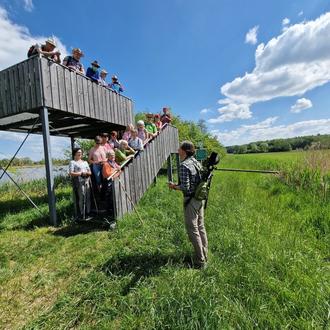 Unser erstes Ziel war der Aussichtsturm im Vogelschutzgebiet, der nach etwa 3,5 Kilometern erreicht wurde. Ab ungefähr 11:30 Uhr lauschten wir dort gespannt einem faszinierenden Vortrag von Udo Baake, der mit seinem umfassenden ornithologischen Wissen alle fesselte.