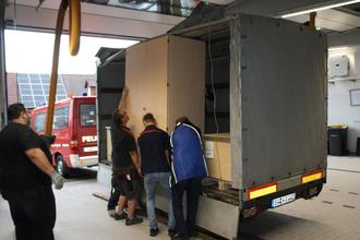 Gemeinsam wird der Schrank für die Kleiderkammer abgeladen.