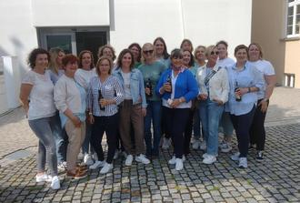 Der ein oder andere Bergrheinfelder Bürger wird sich schon gewundert haben, warum am verregneten ersten Juni 22 Frauen mit Koffern, Nähmaschinen, Skateboards, Walking-Stöcken und manch anderen Accessoires ins Rathaus eingezogen sind. Der Grund war ein professionelles Fotoshooting vom Landesverband des Katholischen Frauenbundes. Hierzu waren wir in einem Auswahlverfahren ausgesucht worden. Frau Ulrike Müller-Münch, Referentin des Landesverbandes Bayern, Schwerpunkt Öffentlichkeitsarbeit kam mit dem bekannten Fotografen Florian Bachmeier zu uns in den Zweigverein, um einen ganzen Tag an verschiedenen Orten in Bergrheinfeld professionelle Bilder für Plakate, Homepages, die Zeitung „engagiert“ und viele weitere Aktionen zu machen. Von zehn bis 18 Uhr hieß es: „Lächeln! Ernst schauen! Bisschen mehr nach rechts/links“, um uns möglichst gut ins rechte Licht zu rücken.