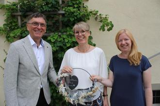 Die „Konrektorin mit Herz“ der Grundschule Bergrheinfeld Annette Schäfer freut sich über ihre Ernennung, eingerahmt von Rektorin Katharina Menth und Bürgermeister Ulrich Werner.