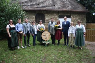 Nach der Proklamation des neuen Schützenkönigs der BSB Bergrheinfeld (von links): zweite Schützenmeisterin Magdalena Müller, Leon Popp, Bürgermeister Ulrich Werner, Elke und Sabine Burkert, David und Ilka Matthes, Landrat Florian Töpper, Joel Popp und Schützenmeisterin Anita Schneider.
