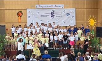 Zusammen probte man vier Stunden im Vereinsheim die vorher abgestimmten und schon in den Einzelchören seit Wochen einstudierten Lieder. Gestärkt durch das gemeinsame Pizzaessen ging es dann zur nahe gelegenen Grundschulaula. Dort wartete zum Abschlusskonzert vor Publikum die liebevoll dekorierte Bühne auf die Kinder. Nach Einzelauftritten der Chöre aus Schwebenried, Kleinlangheim und Kürnach folgte der 60 Kinder umfassende Projektchor. Dieser begeisterte stimmgewaltig die 170 Zuhörer mit vielseitigen deutschsprachigen Liedern und auch mit Pop-Rock-Songs wie „Major Tom“ und „Applaus, Applaus“. Die Kanons konnten dann von drei Chorleitern gleichzeitig dirigiert werden.