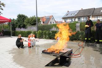 Mit dem Wasserlöscher gegen die Flamme – hier sind die beiden Jungen erfolgreich.