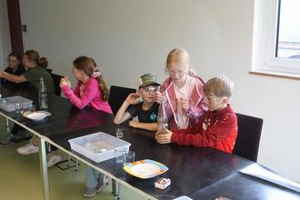 Im Schulungsraum erlebten die Jungen und Mädchen unter der Regie von Simone Marquardt die naturwissenschaftliche Erklärung für Alltagsphänomene unter dem Titel „Wie funktioniert das?“ Der vermeintliche Flaschengeist entpuppte sich als erwärmte Luft, die durch Ausdehnung ihres Volumens die Münze auf der Flasche in Bewegung setzte.