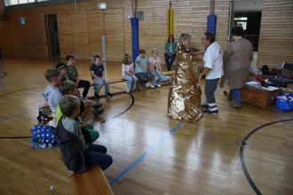 Ein Verletzter braucht Wärme: Mit Hilfe einer Rettungsdecke probierten dies die jungen Ersthelfer beim „Trau-Dich-Erste-Hilfe-Kurs“ des katholischen Frauenbunds im Rahmen des Ferienspaßprogramms der Gemeinde.