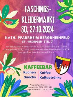 Wir laden euch ein zum 1. Bercher Faschingskleidermarkt am 27. Oktober 2024 ins kath. Pfarrheim Bergrheinfeld.