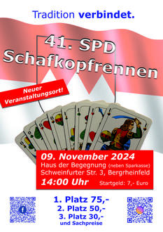 Der SPD Ortsverein Bergrheinfeld/Garstadt lädt herzlich alle Schafkopf-Begeisterten zum 41. Schafkopfrennen ein.