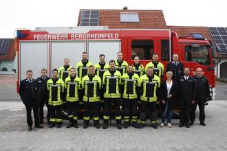 Die Bergrheinfelder Feuerwehrleute nach bestandener Leistungsprüfung „Technische Hilfeleistung“ zusammen mit (von links) Kommandant Matthias Endres, KBM Matthias Steinmüller Bürgermeister Ulrich Werner, Kreisbrandmeister Rainer Wischer sowie (rechts) dritte Bürgermeisterin Friederike Weippert, zweiter Kommandant Daniel Hornung, KBI Andreas Schraut und KBM Rainer Wischer.