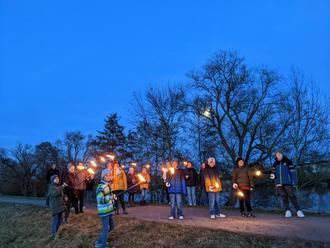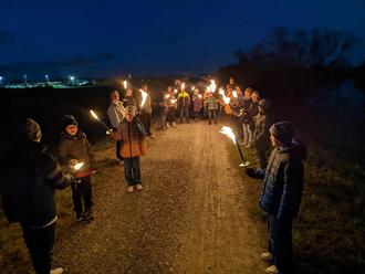 Dort angekommen hörten wir kurz, dass es auch in der Bibel oft um Feuer geht und es toll ist, dass viele Menschen so „Feuer & Flamme“ für Jesus und die Kirche sind, auch wir Ministranten. Nach einer kurzen Einweisung zum Umgang mit Fackeln und Feuer ging es dann endlich los – wir entzündeten die Fackeln und liefen in die Dunkelheit.