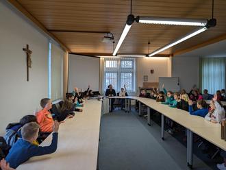 Während eines Schulvormittags im November besuchten die 4. Klassen den Bürgermeister im Rathaus. Neben der Besichtigung der Räumlichkeiten, erhielten die Kinder Einblicke in den Alltag des Gemeinderats.