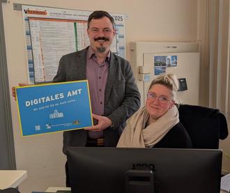 Das Bild zeigt den 1. Bürgermeister Nehmer und Frau Gergert eine Mitarbeiterin des Bürgerbüros.