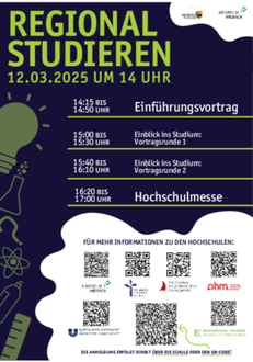 Am Mittwoch, 12. März 2025, findet von 14.00 Uhr bis 17.00 Uhr die Infoveranstaltung „Regional Studieren“ statt. Hierbei stellen die Hochschulen Ansbach, Treuchtlingen und Triesdorf sowie die Evangelische und die Technische Hochschule aus Nürnberg, die Universität Eichstätt-Ingolstadt und die Katholische Universität Eichstätt in kurzen Impulsvorträgen ihre Studienangebote vor. Die Teilnehmer haben so die Möglichkeit an einem Nachmittag zwei von sechs regionalen Hochschulen kennen zu lernen. Am Ende der Veranstaltung findet eine kleine Messe statt, bei der sich alle Hochschulen und die Agentur für Arbeit vorstellen und Fragen beantworten. Die Veranstaltung ist kostenlos. Eine Anmeldung unter www.landkreis-ansbach.de (Regional Studieren) ist erforderlich.