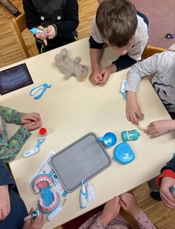 Im Kindergarten wurde das Thema mit der Geschichte „Zack zack zum Zahnarzt“ weiter vertieft. Ein Zahnarzt-Spielset ermöglichte es den Kindern, selbst einmal in die Rolle des Zahnarztes zu schlüpfen und an einem Gebiss zu üben. Dabei wurde auch erforscht, wie viele Zähne wir haben, was Milchzähne sind und welche Bezeichnungen die verschiedenen Zähne tragen.