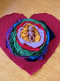 Wir haben Gedichte gelernt, Geschichten gehört und (siehe Bild) darüber philosophiert, wie sich Mama und Papa auf uns gefreut haben. Was haben sie wohl als erstes zu uns gesagt? 10 Monate der Schwangerschaft warten geschafft und wir wurden von unseren Eltern in die Arme geschlossen. „Wir haben uns so auf dich gefreut, wie schön, dass du bei uns bist“, oder „So lange haben wir auf diesen Tag gewartet“, „Wir lieben dich“.