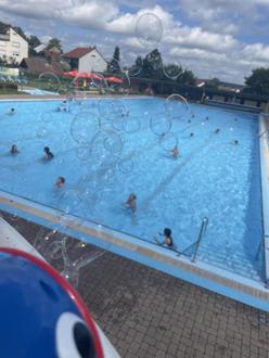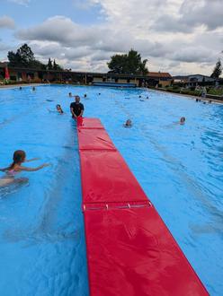 "Was ist denn hier los?", fragten die Stammbesucher des Freibads in Lichtenau sichtlich erstaunt, als sie zur gewohnten Uhrzeit eintrafen. Ca. 120 Kinder hatten gemeinsam im Schwimmbecken Spaß und wurden dabei von Bademeister und Top-Animateur Markus ordentlich eingeheizt. Nach einer gemeinsamen Aufwärmrunde im Wasser konnten die Schülerinnen und Schüler sich an verschiedenen Stellen austoben, denn geboten war einiges: Ein Schnelligkeitswettbewerb an der Rutsche, Wassermatten-Wettrennen, springen und tauchen an den Startblöcken und eine Mattenbahn über das Wasser. Wem das Nass zu kühl wurde, konnte auf der großen Wiese Fußball spielen oder in der Sonne zur Musik tanzen. Beschallt von der Musik und glücklichem Kindergeschrei schwamm es sich dann auch für die restlichen Besucher noch interessanter. "Das ist schön, wenn hier mal was los ist", sprach eine Schwimmerin im Becken zu ihrer Begleitung. Nach einer Stärkung am Kiosk drehten die Kinder noch einmal auf und genossen ihren etwas anderen Schultag in vollen Zügen. Dabei wurden sie vom Bädercoach-Team und den Lehrkräften durchgehend beaufsichtigt und fühlten sich rundum wohl. Ein vollends gelungener und super organisierter Vormittag fand pünktlich um 12:30 Uhr sein Ende. Wir sagen DANKE an die Gemeinde und das Freibad Lichtenau samt Team, dass die Kinder diesen großartigen Tag so erleben durften! Wir hoffen sehr, dass wir im nächsten Jahr wieder die Chance dazu haben.