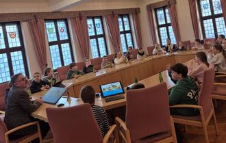 Zum Abschluss ging es noch in den Sitzungssaal. Bei Brezel und Fanta trafen sich die Schülerinnen und Schüler zu einer kleinen Runde mit dem Bürgermeister. Wie bei einer echten Gemeinderatssitzung nahmen die Kinder auf den Stühlen der Gemeinderatsmitglieder platz und bekamen so einen authentischen Eindruck von der kommunalen Arbeit.