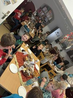 Am Freitag, den 01.12.2023 war bereits der Hortweihnachtsmann in unserer Einrichtung und beschenkte unsere Kinder reichlich mit verschiedensten Beschäftigungsmaterialien, Spielen und einem übergroßen neuen Puppenhaus. Nach der Bescherung und einem leckeren Adventsbuffet, dass durch unsere Horteltern ausgestaltet wurde, hatten die Hortkinder noch mächtig Spaß bei einer weihnachtlichen Zaubershow mit „Wendulin“.
