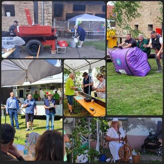 Der Tag war wieder mit einem bunten Programm gespickt, sodass es sich die Gäste bei Erbsensuppe, Grillgut und vielen Sorten an Kuchen gutgehen lassen konnten. Die Original Heidetaler Blaskapelle aus Lieskau verschönte den Vormittag mit ihren Klängen. In den Nachmittagsstunden begeisterten die Bewohner des Pflege- und Seniorenzentrums Allstedt und die Lollipops des AGV e.V. mit einem Beitrag. Der Kindergarten Kreuzberg hatte ein volles Programm rund um die Feuerwehr dargeboten und die Kinderkrippe Rotkäppchen bot mit Mal- und Bastelideen einen Zeitvertreib für die Kinder an. Zudem wurde die Hüpfburg wieder sehr gut angenommen. Auch sonst kam keine Langeweile auf. Neben dem Verkauf der neuesten Ausgabe des „Allstedter Lindenblatt“, älteren Ausgaben und anderer geschichtlicher Literatur über unsere Heimat, konnte man unserer Elke Wagner zusehen, die ihre Wolle auf eine Spindel sponn. Der Heimatverein lockt mit den Kidstreffen immer wieder interessierte Kinder an, um Spaß zu haben, Wissen zu erlangen und gemeinschaftliche Unternehmungen zu tätigen. Da uns unsere nachfolgende Generation am Herzen liegt, leistete der Verein bereits eine größere Spende an die Mosswichtelgruppe, um den Erhalt der Waldkindergartengruppe von immerhin 16 Kindern aufrechterhalten zu können. Zum Hoffest sollten weitere Spenden fließen und so wurden die Vertreter der drei Einrichtungen Krippe Rötkäppchen mit der Leiterin Frau Sindy Seidler, Kita Kreuzberg vertreten durch Frau Heike Neuner und den Hort Pfiffikus durch die Leiterin Marita Kamprath auf die Bühne geholt, die je einen Wertscheck von 100 € erhielten. Die Damen zeigten sich überrascht und sehr dankbar. Ebenfalls überrascht wurde unser Vereinsvorsitzender vom Heimatverein. Dirk Albrecht ist seit dem 06.06.2023 Mitglied im Verein und fand seine Bestimmung als Vorsitzender am 06.02.2009. Damit ist er nunmehr 15 Jahren in seiner Position und wurde hierfür mit einem Präsent, einem guten Gin aus Salzatal und feinster Trüffelschokolade aus Erfurt, beschenkt.