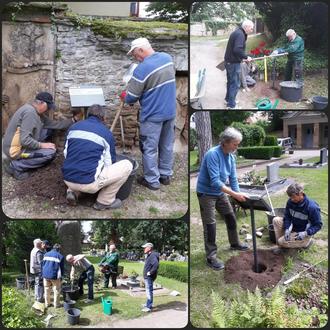 Zur praktischen Umsetzung agierten jedoch viele weitere Akteure, die vornehmlich aus den Mitgliedern der Geschichtsgruppe entstammen. Diese haben sich Gedanken gemacht und Einsparpotenziale immer im Blick behalten. Nachhaltigkeit spielte dazu ebenfalls eine Rolle, weshalb Helmut Kunert die Idee aufgebrachte, die Ständerrohre aus den rostfreien Halterohren des alten Schwimmbades zu nutzen. Gesagt, getan machten sich er und Helmar Roland ans Werk diese zuzuschneiden, während Maik Perufsky auf Helmut seine Vermittlung hin die Unterlagen für die Texttafeln herstellte und letztlich alles zusammen schweißte. Als gelernter Bauingenieur konnte man ebenso auf die Unterstützung von Rudi Krimmling zählen, der den Friedhofsplan erstellt hat, sowie die Textträger und Rohre grau strich. Dies erfolgte nach Angaben von Rainer deshalb, da die Denkmalpflege selbstverständlich nicht außen vor gelassen werden durfte und entsprechende Vorgaben eingehalten werden mussten. So war eine davon, dass kein glänzender rostfreier Stahl verwendet werden sollte.
